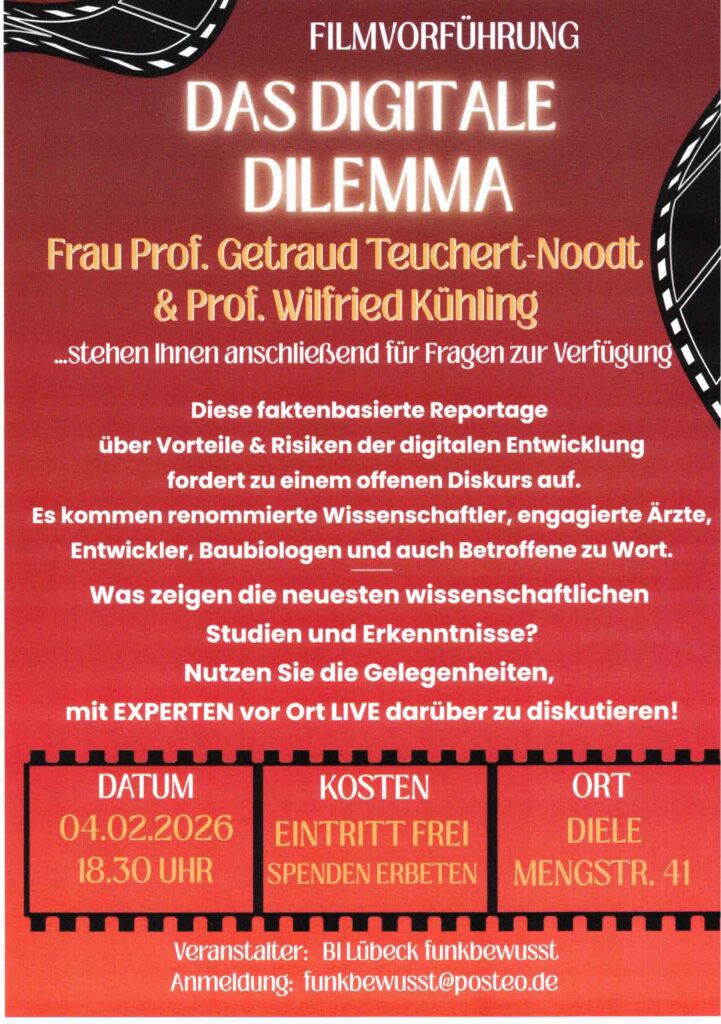 Filmvorführung – Das Digitale Dilemma – 4.02.2026 18:30Informationen und Termine Ort: Diele, Mengstr. 41Eintritt frei – Spenden erbeten https://luebeck-5gfrei.de/wp-content/uploads/2026/01/Das-digitale-Dilemma-Filmvorfuehrung-4.02.2026.pdf